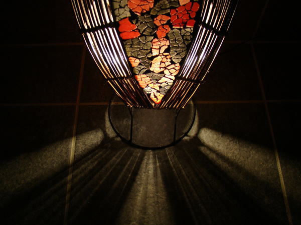 リディーとクラッシュガラスをモザイク状に貼り付けたアジアンランプです。 南国のココナッツリーフをモチーフにした華やかなランプです。 裏面にもモザイクを施しているので、側面からの鑑賞にもたえられます。 モザイクから漏れる灯りは、華やかなので是非目立つところに置いて下さい。背面上部は、光が漏れるので、壁際に配していただくと奥行きがでます。