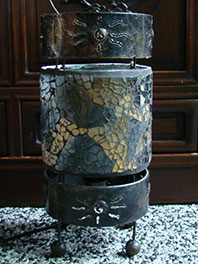 モザイク部分のこもった灯りが印象的なアジアンランプです。 当店ではおなじみのアイアン部分の太陽の模様からもれる影と 素敵なコラボです。 モダンアジアンな灯りをお楽しみ下さい。
