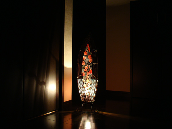 リディーとクラッシュガラスをモザイク状に貼り付けたアジアンランプです。 南国のココナッツリーフをモチーフにした華やかなランプです。 裏面にもモザイクを施しているので、側面からの鑑賞にもたえられます。 モザイクから漏れる灯りは、華やかなので是非目立つところに置いて下さい。背面上部は、光が漏れるので、壁際に配していただくと奥行きがでます。