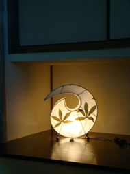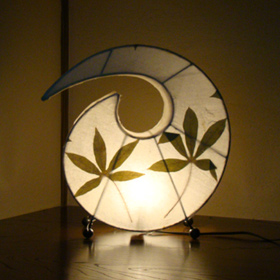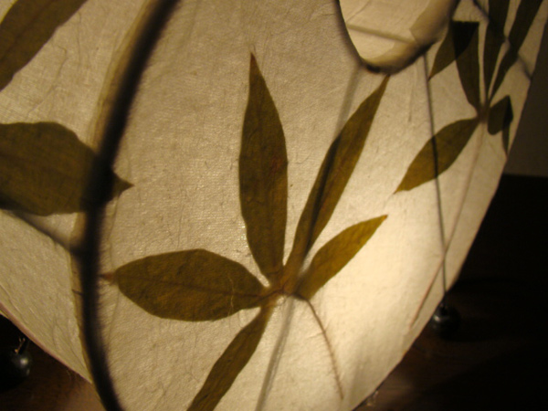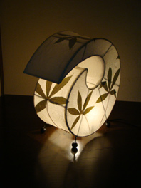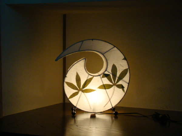 布地に自然の葉をアレンジし手漉き紙で挟み込んだ和を感じさせる照明(ランプ)です。 日本の様に繊細な手漉き紙ではなく、布地の上に植物の繊維が塗りつけられているような表面です。 はさみこんだ葉は、正面はもちろん、側面にまで配置されているので、葉の影が木漏れ日を感じさせてくれます。 勾玉のような変わった形もインテリアとして十分アクセントになりますね。 現地では、アンモナイト型と呼ばれていたのですが、当店ブログ読者様に「勾玉・斜葉」という名前をつけていただきました